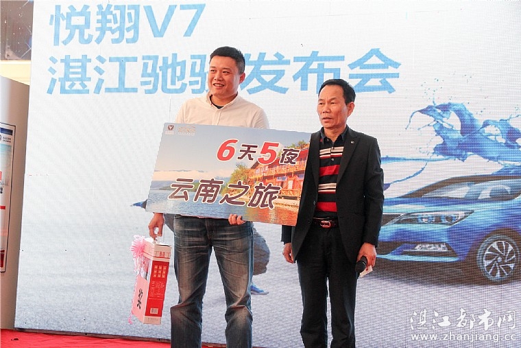图为颜总与销售经理为来宾客户们揭开悦翔V7的神秘面纱