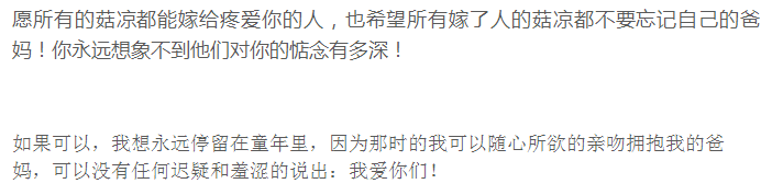 “ 有一大姑娘,她爸她妈养活了她二十多年。没吃你们家一口饭,没喝你们家一口水,就是因为她喜欢你,她爱你,嫁给了什么都不是的你,把你的父母当成她的亲爸亲妈,跟你一块儿过日子,还得照顾你,还得容忍你,从一个如花似如的大姑娘熬成一个大妈。十月怀胎生一孩子,还得跟你姓,她容易吗?”