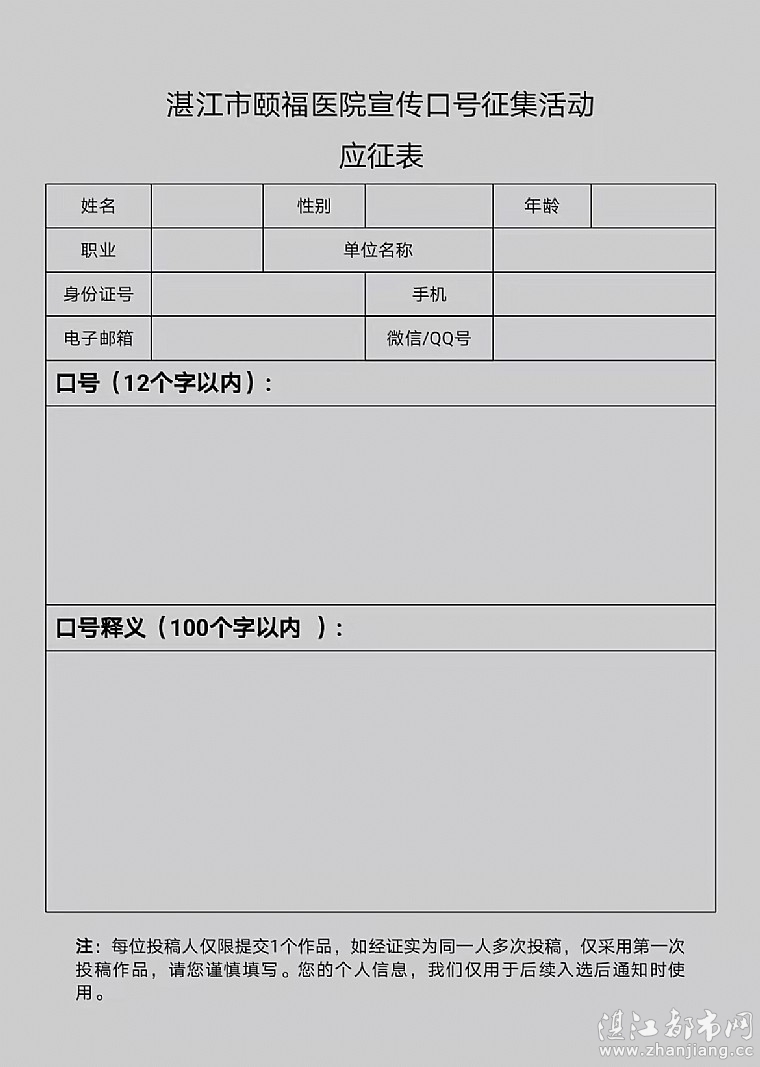 1、应征作品可以以文字稿或电子表格的形式提交。以文字稿形式请填写《湛江市颐福医院宣传口号征集活动应征表》并邮寄(见附件1);以电子表格形式请填写应征电子表格(点击“阅读原文”进入),或在“湛江市养老服务中心”微信公众号回复“口号”获取应征电子表格链接。