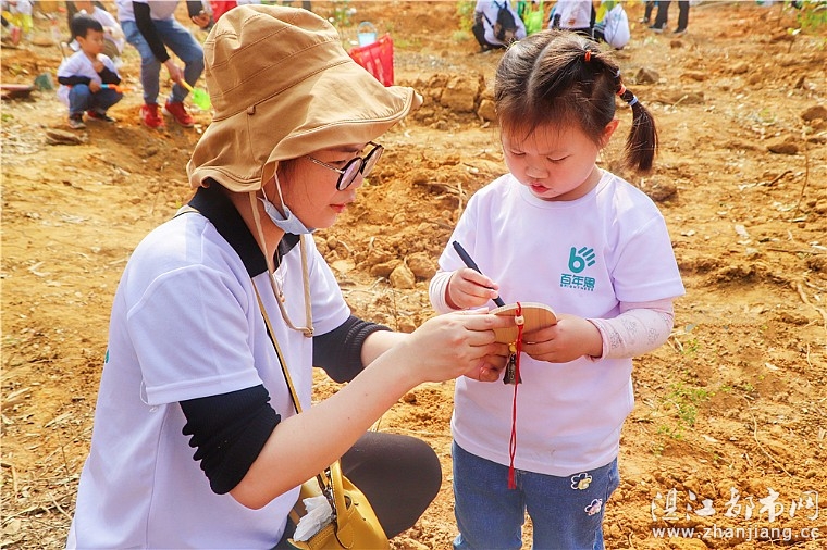 启动仪式后,亲子家庭以幼儿园为单位,到达幼儿园所在的植树区,找到各自的果树。家长领取锄头、铁锹、水桶等植树工具后,与孩子一起扶苗、铲土、培土、取水、浇水、写心愿牌和挂心愿牌,种下芒果、黄皮、荔枝、龙眼和菠萝蜜等6种树苗,度过美好的亲子时光。