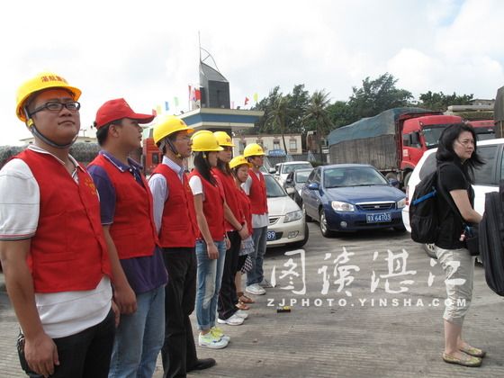 青年志愿者在地磅入口指引车辆购票过海