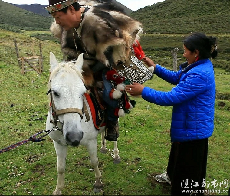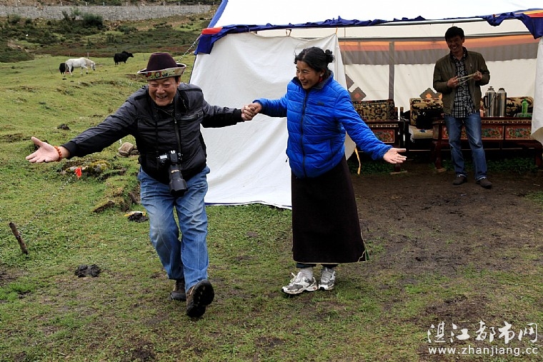 - [2014-11-09]西藏十日 鞭指天路(之十四) 作客藏家 [图]啜酥油茶 喝青稞酒 驰骋草原 从林芝回拉萨的途中,见藏胞帐篷,星星点点地散布于山坡下,山坡前,绿草如茵,牛马成群,路边有曲桥,跨过小溪,溪水清澈见底。曲桥后有小道迂回直至帐篷。于是弃车上坡,藏胞热情相邀,进入帐篷,帐篷内的桌子上,早已摆设牛奶、酥油茶,粃粑,其香气四溢。喝了几杯酥油茶,吃了几撮粃粑,顿时神清气爽,疲倦尽消。环顾四周,见挂有各式藏服,均色彩斑斓。藏胞珠玛说,外有马匹,可着藏服,骑马驰骋草原。 我等平生未骑过马,怕有闪失。珠玛捧出青稞酒,一杯下肚,回肠荡气,壮士豪情油然而生。于是披挂藏服,戴头盔,佩藏刀,飞身上马,正是:春风得意马蹄疾。此刻,风驰电掣于蓝天白云下的草原,春风扑面,马蹄生烟,青山倒退,衣带飞扬!我等乐不思归矣。 忽记伟人诗云:自信人生二百年,会当击水三千尺!在这海拔四千米高原驰骋,夫复何求!