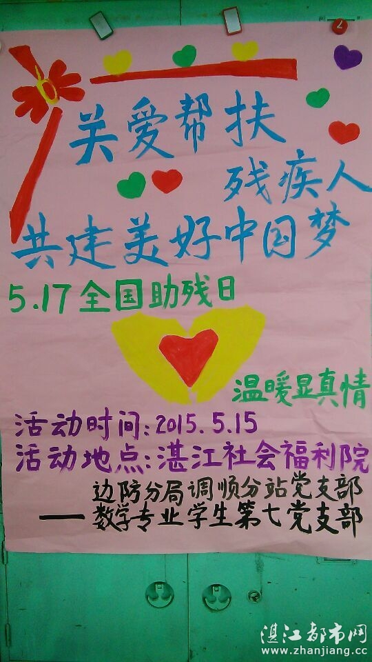 (通讯员/覃青华 摄影/陈小霞)为了积极响应党和国家的号召,推动我市助残事业的发展。2015年5月15日上午,湛江边防检查站调顺分站党支部与岭南师范学院数计学院数学专业学生第七党支部赴湛江社会福利院开展“关爱帮扶残疾人,共建美好中国梦”助残活动。