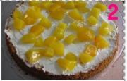 取一片蛋糕抹上打发的奶油,上面撒上切碎的黄桃粒。