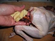 把买来处理好的三黄鸡洗净,切去鸡屁股,然后往鸡肚里塞进姜片、八角,这样蒸出来的鸡,肉里带香,极其美味。