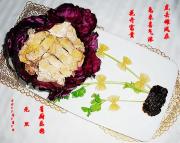 准备好两片紫甘蓝洗净沥干,像图所示放一起,成摆盘花瓣,然后将切好鸡块放入,即可像一朵饱满盛开的花朵。
