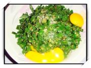 拌均匀辣椒粒韭菜段鸡蛋液。