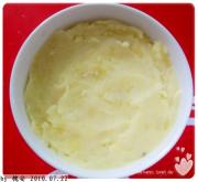 用器具将蒸好的土豆碾成泥,我用的擀面杖,竖着捣捣捣,很快就好了。我以前试过用汤匙压或戴一次性手套捏,也可以,大家可以自由发挥(等凉点了再做哦,别烫着了)。