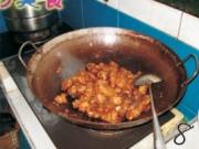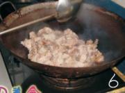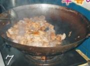 不停的翻炒,让每块肉都均与的沾水糖色,然后放料酒,姜,八角,老抽,盐适量继续翻炒。