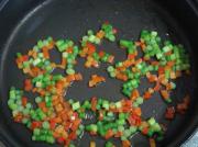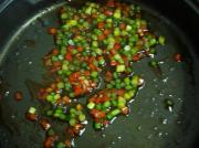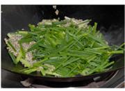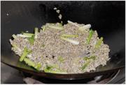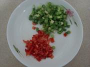 另起锅下1勺油烧热,放入蒜苔、红椒粒翻炒一会。