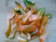 放入青红辣椒,炒断生,放一茶匙糖,一汤匙半蚝油,适量盐(蚝油有咸味,建议酌情)