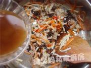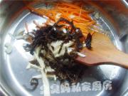 原锅留底油,下入葱花爆香,再下入黑木耳、胡萝卜丝、冬笋丝翻炒片刻。