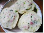 把熏肉.迷迭香和 葱分别 切成碎粒,把它们和牛奶和土豆泥一起搅拌,里面加入适量的盐。