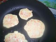 煎锅烧热后,放少量油,用小勺将面糊倒入锅中,摊成小圆饼,有模具就更好了。摊成大饼再切小块也可以。
