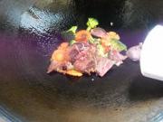 倒入牛肉,炒匀;加入少许高汤、盐、胡椒煮开。