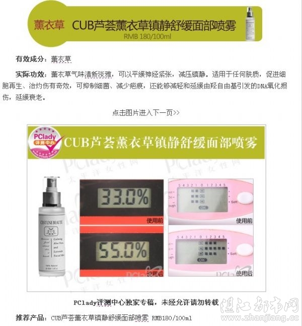 pclady评测编辑推荐理由:cub芦荟薰衣草镇静舒缓面部喷雾,质地通透,温和不刺激。保湿性能优秀,使用后的肌肤水分值提升18%。使用产品后,皮肤含水量和水嫩度明显增加,肤质改善明显。综合来说,是一款出色的喷雾产品,非常适合敏感肌肤使用,亦可以作为空调房中肌肤保湿产品使用。