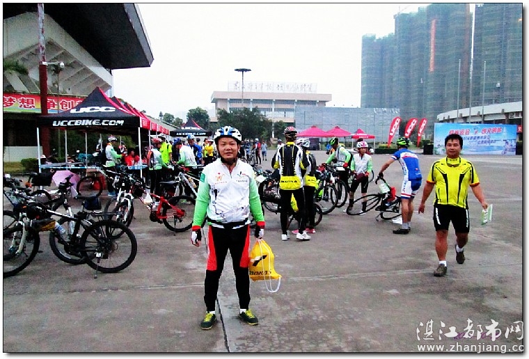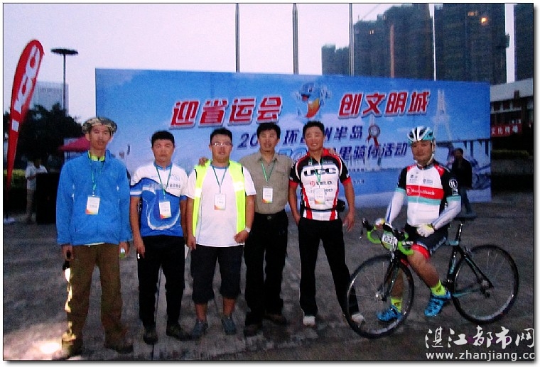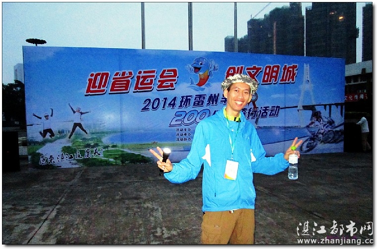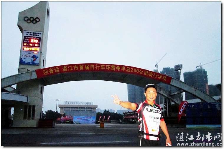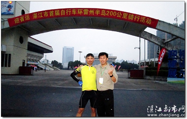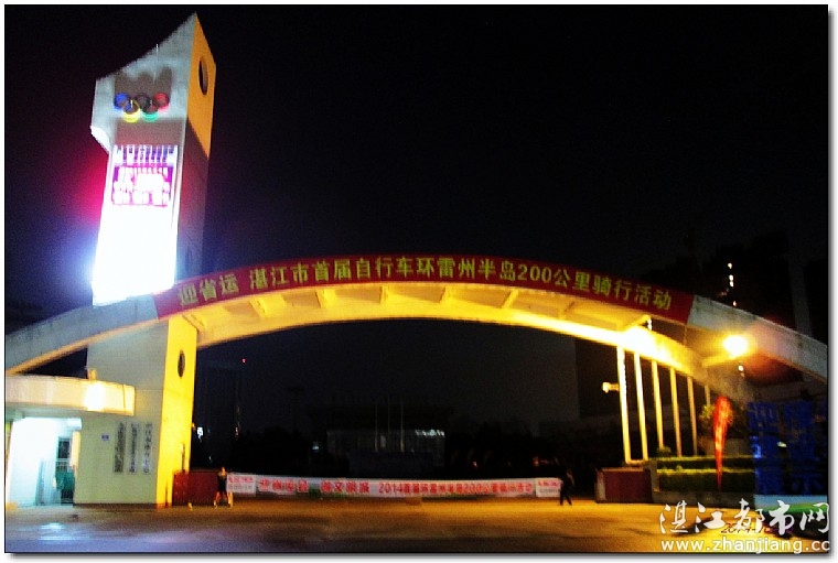 - [2014-10-27]精彩一路 ---- 环雷州半岛骑行活动我的记录 [图]明天,2014首届环雷州半岛200公里骑行活动马上就要开启。 凌晨5点被温柔的催醒,不再躺下了,洗漱后给自己美美的煎了个鸡蛋,吃了个最早的早餐,出发前往体育中心,天还黑着,下过小雨的路面在路灯的映衬下,亮起一道金灿灿的金光。5点40分的体育中心背景墙已经搭好,而大门拱门上,“2014首届环雷州半岛200公里骑行活动”横幅赫然醒目,今天是湛江自行车活动幸福的一天,能够参与其中不由得心随着时间的推移也渐渐的兴奋和激动起来...... 还是让我们随着图片跟随着众神一同走过今天吧 体育中心正门湛哥港哥正在大门合练拉横幅预演 5:45分