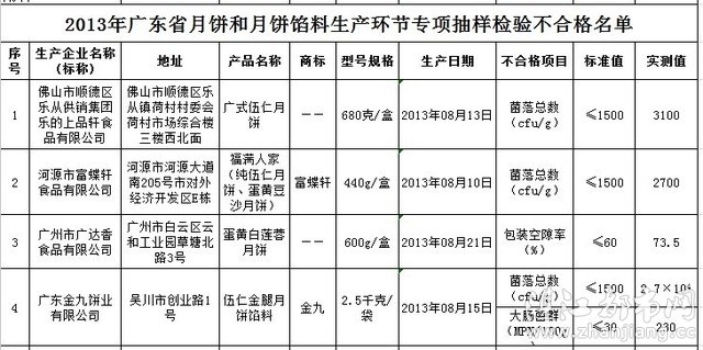 日前,广东省质监局对省内企业生产的月饼和月饼馅料进行了专项抽样检验,发现有月饼馅料菌落总数超标18倍,大肠菌群超标7倍多。据悉,本次共抽检样品141批次,发现内在质量不合格样品4批次,内在质量不合格产品发现率为2.84%。
