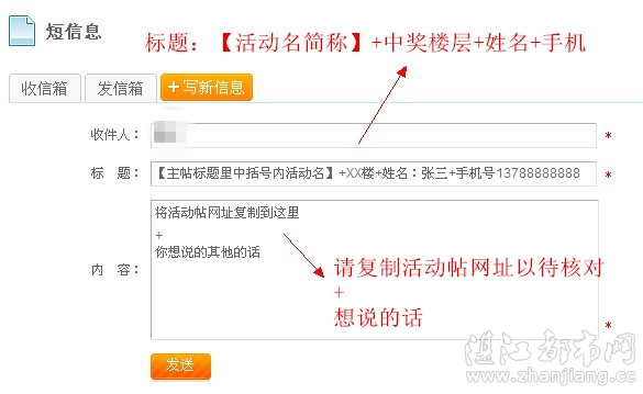 中奖登记: 为了领奖时能确认身份,成功抢到上述指定楼层的网友,必须在中奖当天17:00前将您的姓名、手机号码以站内私信的方式发给楼主(姓名应为与身份证一致的姓名,手机号码应为实际领奖时将携带的手机号)。 未在指定时间内按以上要求中奖登记的,视为弃奖,自行领奖的,我们有权拒绝发放奖品。 登记方法参考如下: