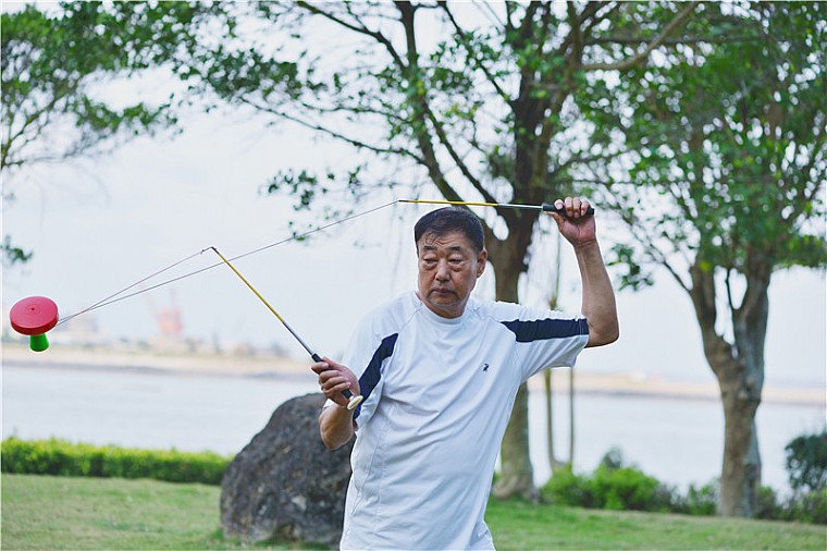 今天下午在金沙湾见到一长者抖空竹,一种北京公园常见的玩法。
