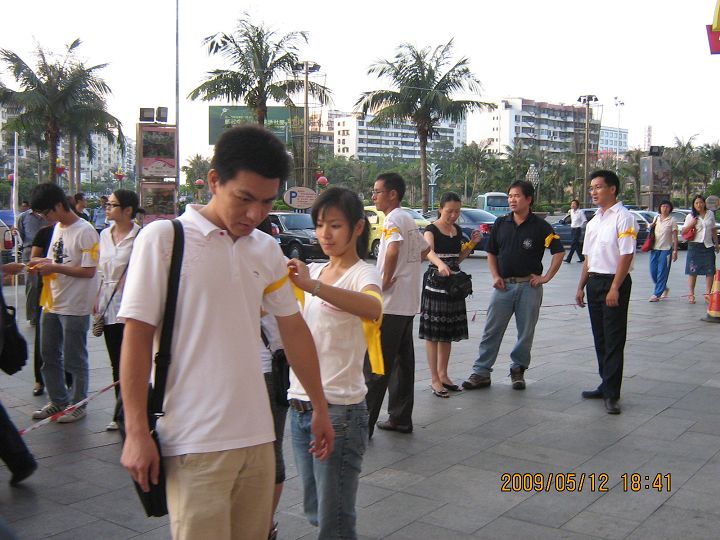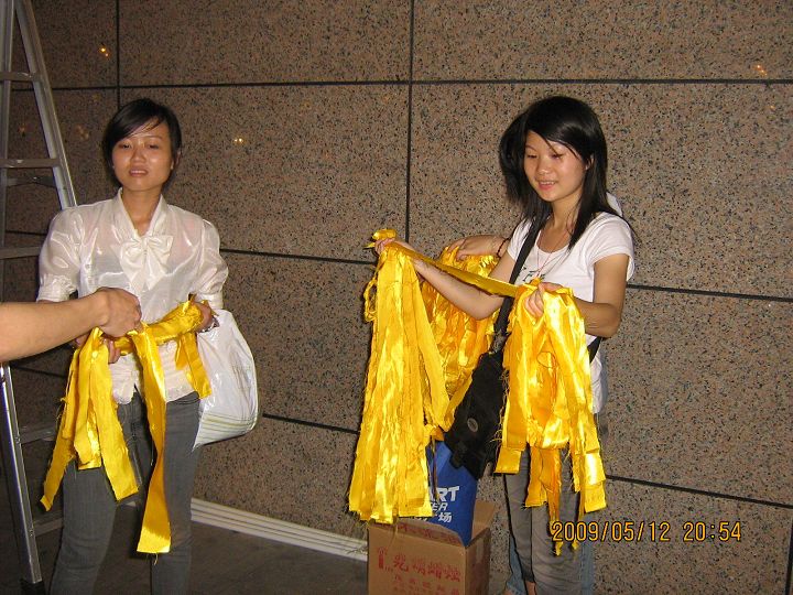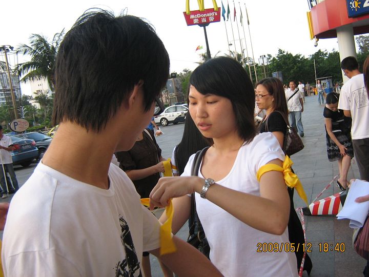 爱心志愿者都相互帮助系上庄重的黄丝带