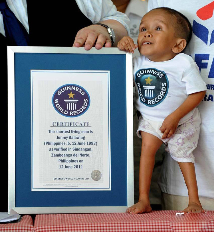 全球最矮成年男子将很快刷新纪录。据香港12日报道,6月13日年满18岁的菲律宾人Balawing,身高仅22吋(约56厘米),打破26.4吋(67厘米)高的尼泊尔人马加尔的纪录。《吉尼斯世界纪录》将于稍后前来为他测量身高。