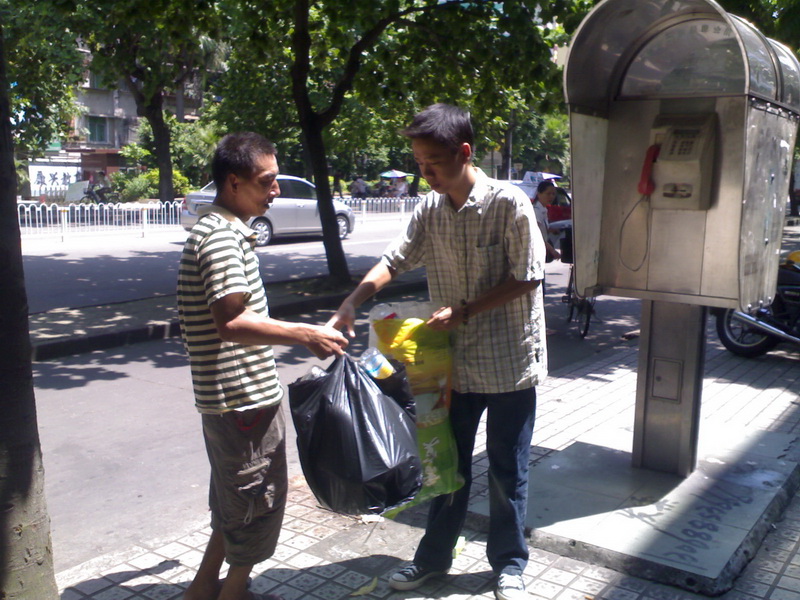 8月22日上午,我在情暖Q群里聊天,忽然一个陌生的头像在晃动,收到了一个临时会话的信息,打开一看: 滨城一粟 9:41:24 其实我今天想找你的,你上次说的那个什么人是捡垃圾的是吧 滨城一粟 9:41:42 他在哪的啊,如果我有这方面的东西我送去给他 滨城一粟 9:41:58 呵呵,要在霞山区内才送货上门的哦 原来是只见过一面,网名叫“滨城一粟”的志愿者MM,没想到她还记得我,更没想到她还记得我文章介绍过的残疾人阿宝(文章链接http://qn.zhanjiang.cc/bbs/dispbbs.asp?boardid=6&Id=8661&page=3)。她想把自己和同事喝剩的纯净水塑料瓶捐给阿宝,由于阿宝行踪无定,也是他经过我店铺才有缘遇见,所以我建议我上门接收以后交给他,于是我把手机号码留给滨城。 两天后的晚上8点左右,我接到了一个陌生的电话,一接听,原来是滨城打来的,她说:“11点左右到步行街办事,顺便拿塑料瓶给阿宝,他在哪里?”我说:“阿宝晚上不出来的,他上办公室时间,上午9点-12点半,下午3点-6点半会在步行街捡废品破烂。这样吧,你交给我,第二天我遇见他再转交吧。”于是滨城就和我约了时间和见面地点。快到10点,再次接到滨城电话,我不顾因腿伤扭到水肿的左脚,匆忙的赶去了约定地点。远远就看见滨城,她开着一辆女装踏板小电动车,双腿挂在外面摇摇晃晃过来,我上前一看,踏板上满满两大纤维袋塑料瓶,我想帮忙拿下来提回店铺,她看见我不方便,坚持要帮我用车送到店铺。于是我带她来到店铺,我把塑料瓶放好后,她说:“你们几点收铺?我去妹妹那里吃完啫喱再过来。”我问:“有什么事吗?拿啫喱过来吗?”她不好意思笑笑说:“不是,我看妹妹那里还有什么废品,顺便拿给阿宝。”我说:“不好意思,就快了,我们十点关门,下次吧。我代表阿宝,感谢你的帮助,谢谢!”我被她的热心感动了,再三道谢以后,看着她开着小电动远去的身影,我不禁对之前Q聊语言上的误会感到羞愧,其实滨城是个不错的MM。 有人说献爱心很难,不是出钱出力就是浪费时间,其实,一个塑料瓶,一张废报纸,献爱心就是这么简单,你也可以,你说是吗?逛街的时候,请把你手上可回收的废品,亲手交给有需要的人吧,多谢支持! ![]() ![]() ![]() 来源:情暖湛江志愿者协会