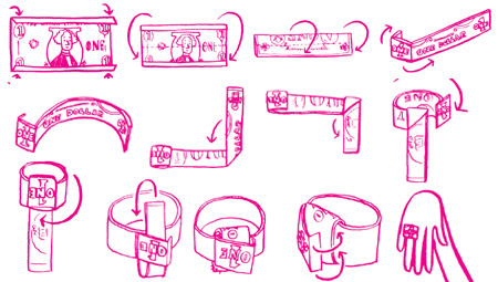 如何制作这样一枚戒指呢? 你需要:任何一种面值的美元纸币。 如果你在找一种将午餐费“戴”在身上的有趣的方法,这便是你所需要的。很早以前,女孩就开始使用这个方法了,时间至少可以追溯至20世纪30年代。