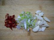 葱切丝,蒜切瓣,干红辣椒切丝。
