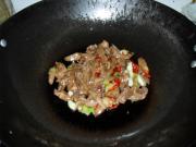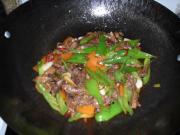 下入胡萝卜,青椒炒至端生,调入适量生抽,蚝油,撒入适量盐,鸡精翻炒均匀即可。