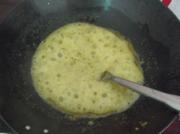 少许油,小火炒蛋黄丁,一汤匙料酒,姜汁,炒散蛋黄。