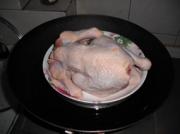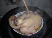 把买来处理好的三黄鸡洗净,切去鸡屁股,然后往鸡肚里塞进姜片、八角,这样蒸出来的鸡,肉里带香,极其美味。