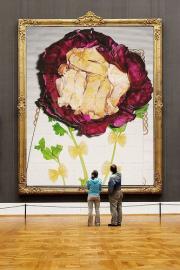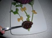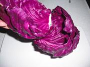 准备好两片紫甘蓝洗净沥干,像图所示放一起,成摆盘花瓣,然后将切好鸡块放入,即可像一朵饱满盛开的花朵。