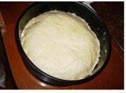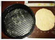 松弛好的面团擀成圆片(略小于模具即可),放入8寸蛋糕膜中(膜里提前撒些玉米粉)。