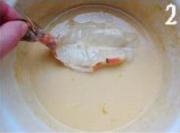 鸡蛋液、面粉、盐、清水、胡椒粉制成调味糊,将收拾好的虾在调味糊里蘸一下。