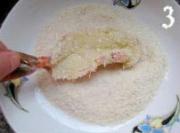 将蘸好调味糊的虾裹上面包糠。