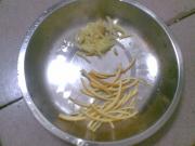 4将橙皮丝平铺于碟放上腌好的带鱼并在撒上姜丝。