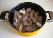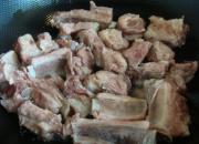 汤锅中接凉水(水量以没过排骨一点点为准),放入排骨,加入葱段和姜片,大火烧开,撇干净浮沫,加入少量料酒去腥,烧开后转小火炖50分钟。