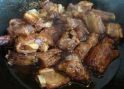 重新取干净炒锅,倒入油,放入冰糖,小火慢慢融化,沿着锅边倒一小碗排骨汤,放入八角,盐,老抽和醋,搅拌成汁,然后倒入排骨,小火焖5分钟。