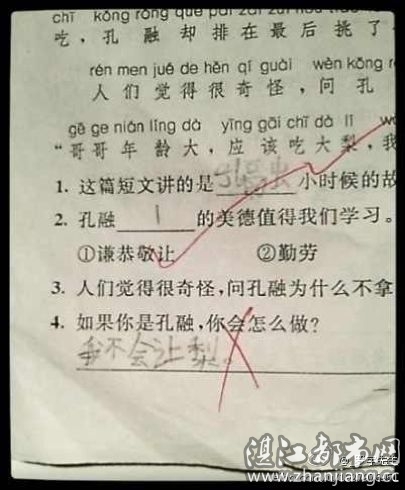 孔融让梨的故事脍炙人口,这个故事作为传统美德教育的素材,十分恰当。但是最近在一次小学语文考试中,有位上海小学生 在回答“如果你是孔融,你会怎么做?”题目时称“我不会让梨”,被老师打了大大的叉。