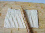 将松弛好的面片开口向外,用压面棍轻轻敲打,再次擀长成长方形,然后三折。