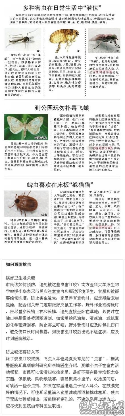 日前广医二院陆续收治了4名恙虫病病人,其中两名老人疑因遭恙虫咬后致病死亡。然而在我们身边,除了恙虫之外还有多少潜伏的“致病虫”呢?记者昨日采访了多名专业人士,揭开这些虫的面纱!为了健康,亲们请戳图学习