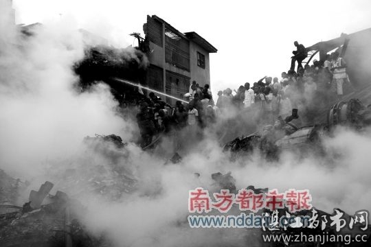 从天而降的客机在拉各斯机场附近撞到当地建筑物后立即解体并引起大火,火焰燃及邻近房屋并冒出浓浓的黑烟。