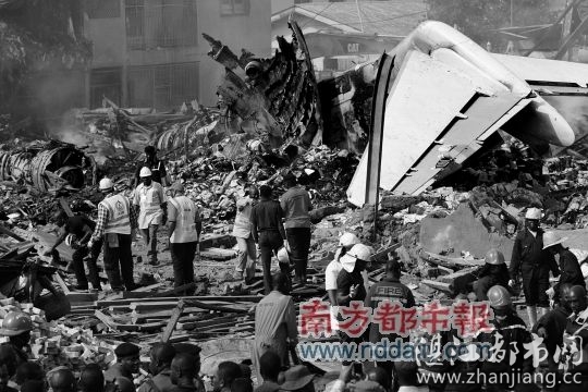 新华社记者在现场看到,一些遇难乘客尸体被压在倒塌的建筑物废墟中,有的已被烧毁,无法辨认。被炸毁的飞机零件也随处可见。当地居民说,救援部门已经把失事飞机机体清理出居民区。