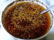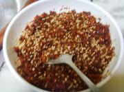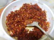 把油烧热,浇在拌好的辣椒末上,油的量最好末过辣椒末3-4厘米;如果一次做的量不够,可以再熬一下再浇哈!浇的时候小心,不要一次性全部倒入,以防热油产生的泡沫溢出,也小心烫伤哦。