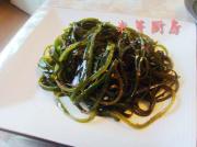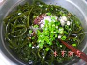 油辣椒做好后,拌盘海带吧!这么一盘海带花了一元钱,拌好正好一盘,放入一大勺油辣椒,再加一大勺油辣椒面上的辣油,一小勺花椒粉,一小勺老抽,少许醋、香油,盐和鸡精,葱花,拌匀即可!还可以根据个人口味加香菜、花生碎什么的,随你怎么喜欢就怎么加吧。