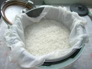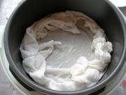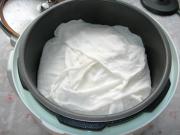 电饭煲里放上蒸笼隔层,把纱布洗过,铺到上面。