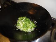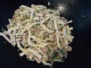 分别加入瘦肉、虾仁和豆干煸炒。