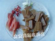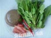 将焖子改刀切片,瘦肉切片,菠菜洗净切段。