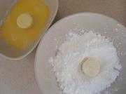 鸡蛋打匀,然后把日本豆腐放入裹蛋液,再放入装了淀粉的碗中沾淀粉。